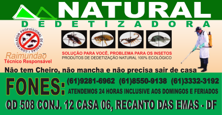 A Dedetizadora Natural é uma empresa que leva a sério o controle de pragas urbanas. Temos uma equipe especializada para o combate de todos os tipos de Pragas e insetos, que tanto mal causa a nossa saúde, verminoses, alergias, parasitas, doenças hemorrágicas como a meningite, dengue, leptospirose, entre outras doenças ou que pode levar a própria morte. Que tanto mal causa em nossos patrimônios, cupins destrói a estrutura de nossas casas, moveis, janelas, portas, pianos, pisos de madeira, esculturas e etc. E nós da Natural combatemos desde microscópicas pulgas, nojentissímas baratas a perigossímos escorpiões. Fazemos o uso de prudutos de dedetização natural 100% ecológico não tem cheiro, não mancha e não precisa sair de casa. Sem contar que trabalhamos com um preço campeão para atender a todos que sofrem com este problema. Não feche serviço com outra empresa sem antes nos consultar, tenho certeza que isso fará bem para a sua saúde e também para o seu bolso, obrigado!
